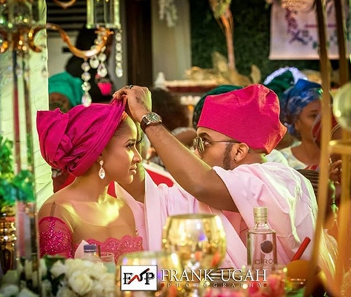 photos of popular singer, Banky W, helping his wife, Adesua, to adjust